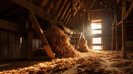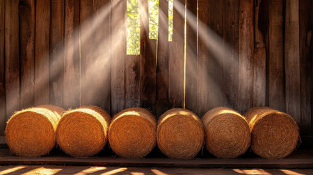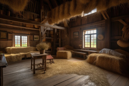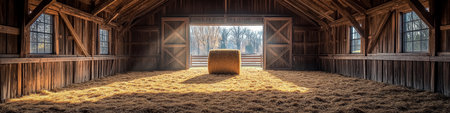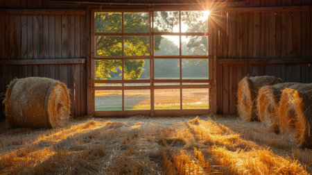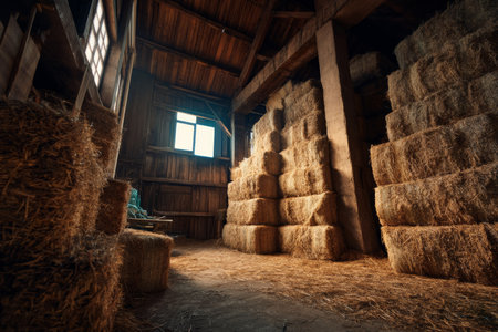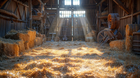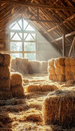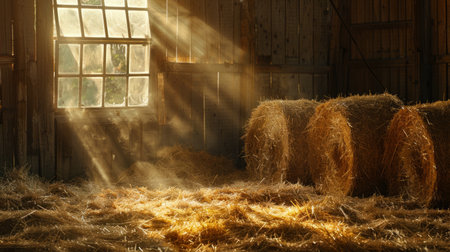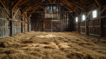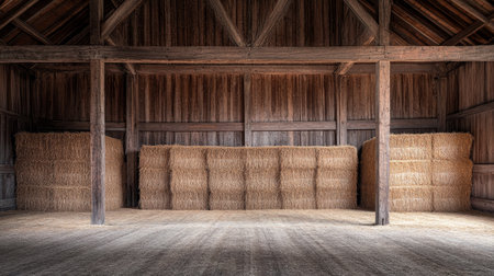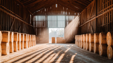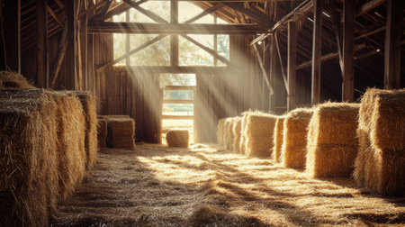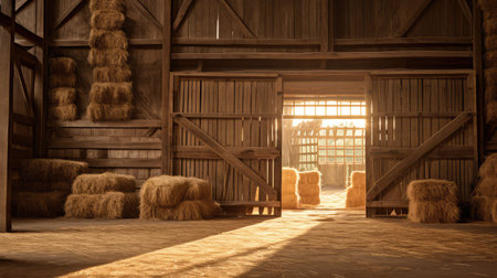 Golden bundles of hay are neatly piled amid aged wooden walls, with sunlight streaming through spacious windows casting warm, inviting glows.
