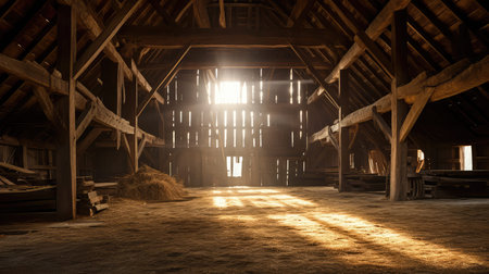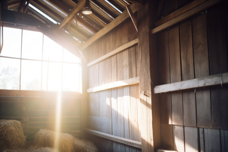 interior shot of barn with sunlight streaming through gaps, created with generative ai