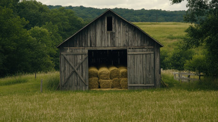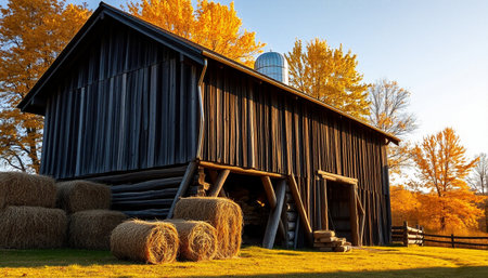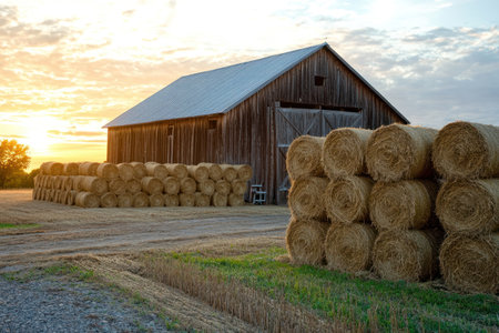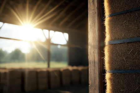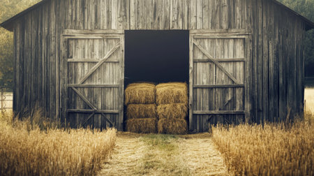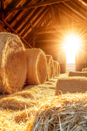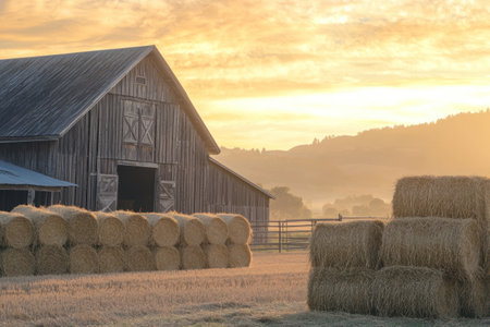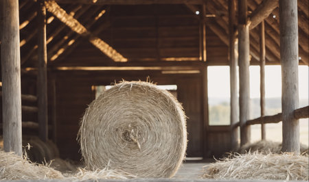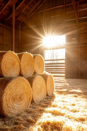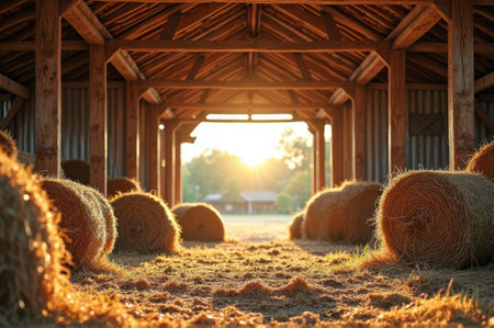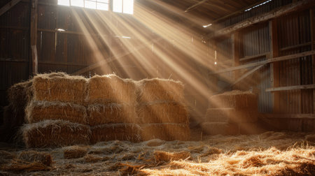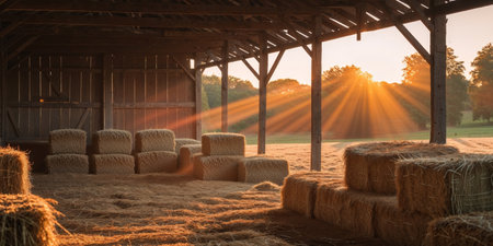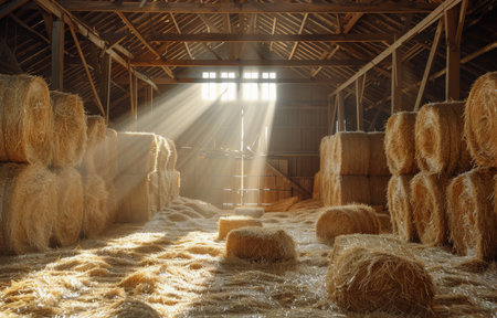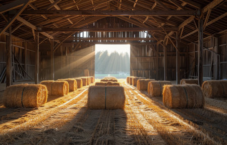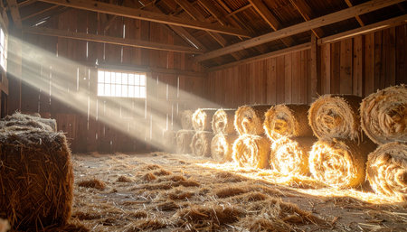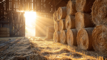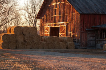 A picturesque barn with stacks of hay bales illuminated by sunlight. This image can be used to depict rural landscapes, agriculture, or farming scenes.