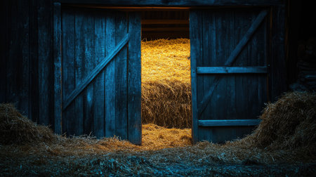 A tranquil view of a rustic barn interior filled with straw bales, sunlit through large wooden doors, evoking a sense of peace and rural charm.