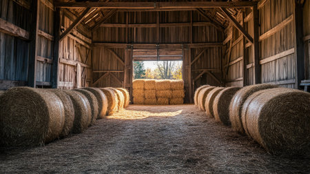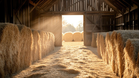 A serene interior of a rustic barn filled with hay bales, where soft sunlight streams through the open doors, creating a warm atmosphere ideal for agricultural themes.