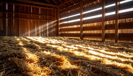 Warm sunlight filters through weathered wooden planks, illuminating soft heaps of straw beneath sturdy beams, creating a peaceful, rustic ambiance.