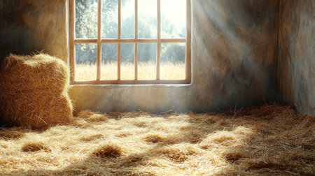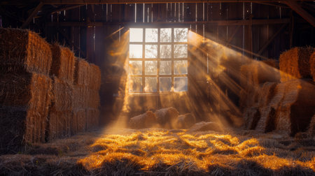 Sunlight streaming through a barn window highlighting hay bales and creating a rustic atmosphere