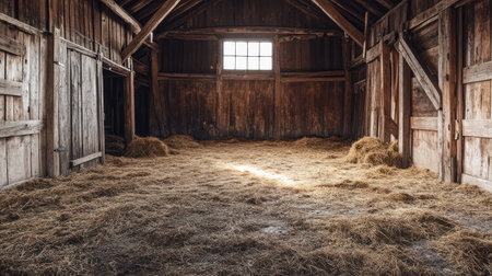 A weathered, empty barn with hay on the floor, dusty wooden beams, and soft sunlight streaming in, creating a rustic scene.