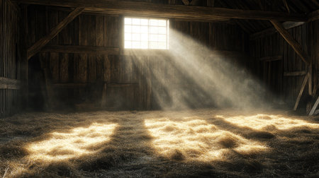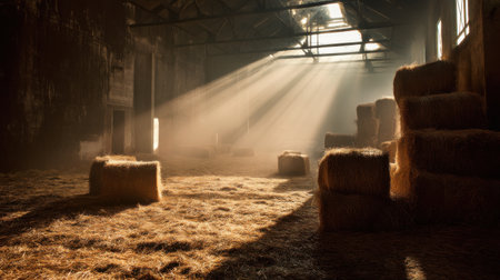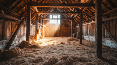 A beautiful barn interior featuring rays of sunlight that illuminate scattered hay bales and wooden floors, creating a warm and peaceful rural atmosphere.