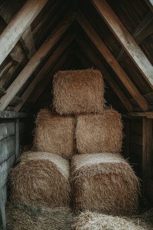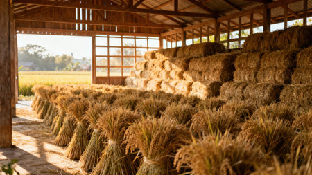 Golden Hay Bales Neatly Stacked Inside Rustic Barn for Livestock Feed and Cozy Bedding
