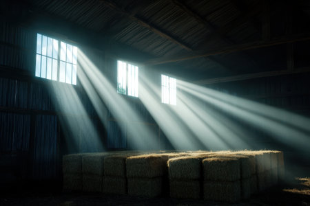 Sunlight streaming through the roof of a barn, illuminating hay bales and creating a warm atmosphere