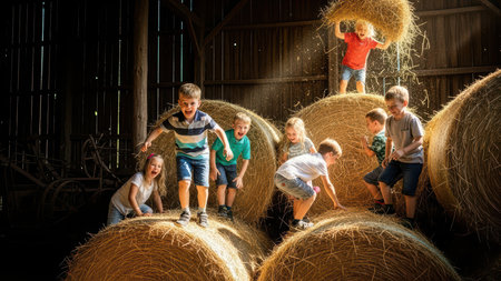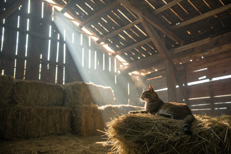 Sunlight streaming through the gaps of an old barn, illuminating the hay and creating a warm, nostalgic atmosphere
