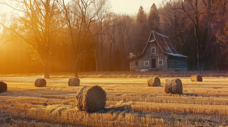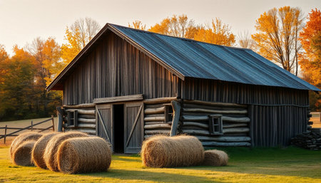 A rustic farm barn with hay bales stacked outside, glowing in golden hour light
