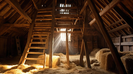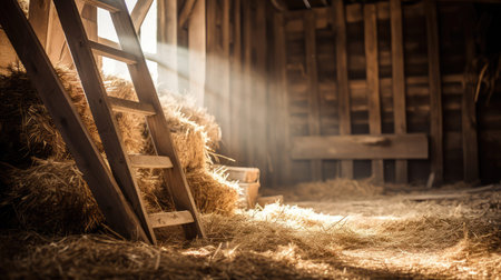 Rustic barn interior background with wooden beams, vintage tools, and textured hay bales. The authentic, cozy feel evokes the charm and warmth of rural life, perfect for countryside themes