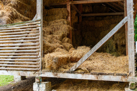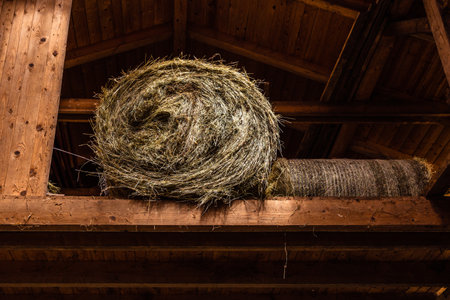 Hayloft in the attic in a wooden shed in the farm. Rolls of hay for winter fodder and livestock.