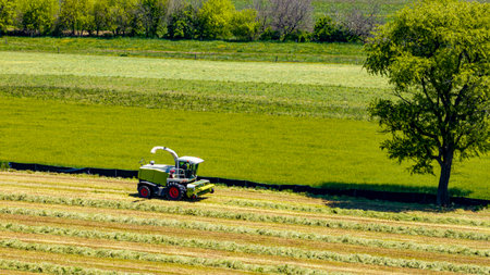 Svitavy, Czech Republic - 20.4.2019: Forage harvest. The John Deere tractor and Claas are harvesting clover for haylage. Agricultural field work