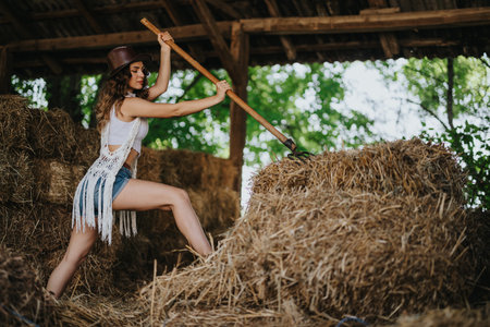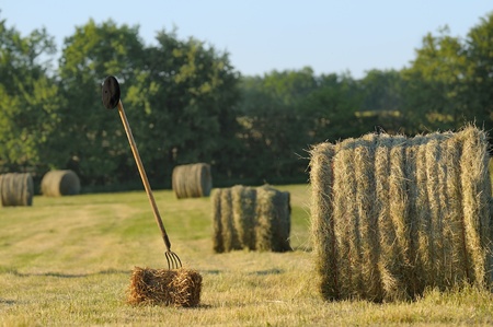 Stack of hay with forks and a rake, against the backdrop of a beautiful rural landscape, on a summer sunny day. Village lifestyle.