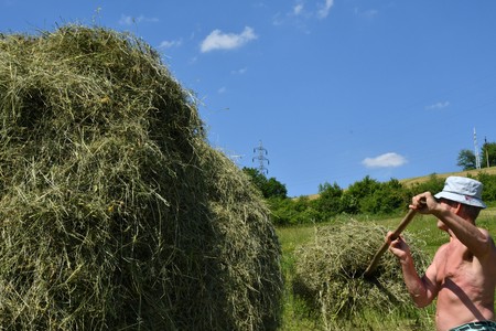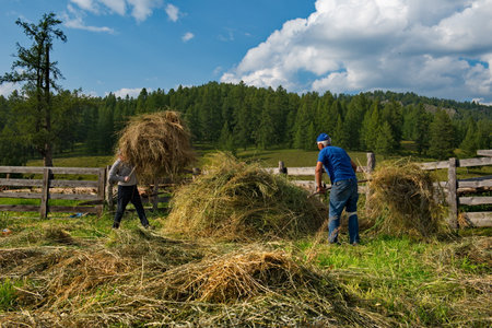 Yabogan. Russia. August 07, 2020. Farmers of the mountain Altai village collect sun-dried hay in large stacks manually with special pitchforks. In this way, food is prepared for cows, sheep and goats
