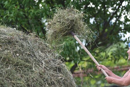 Handsome mature farmer turns the hay with apitchfork on the backyard of farm. Growing livestock is a traditional direction of agriculture. animal husbandry
