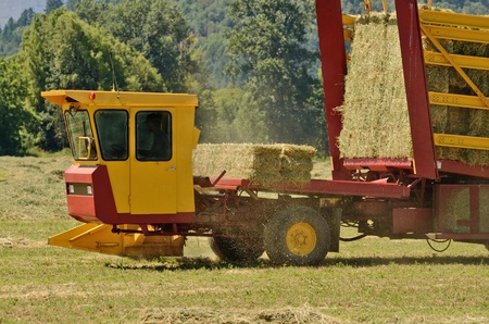 Self contaned hay bale wagon picking up bales of alfalfa from a farm field