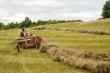 Agricultural work on mowing hay - an old tractor with traces of rust removes earlier hay and forms round wolves of straw.