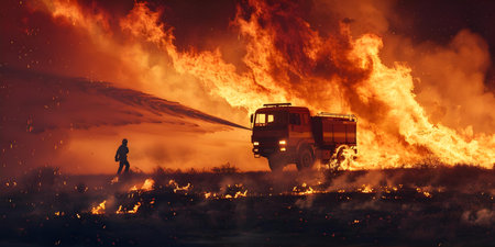 Silhouette of Firemen fighting a raging fire with huge flames of burning timber