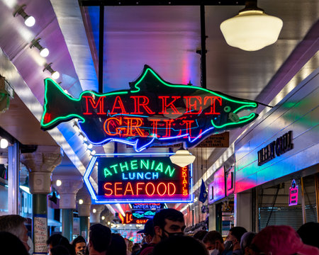 Seattle, WA - US - Sept. 24, 2021 Horizontal interior view of the Market Grill and Athenian Seafood hanging neon signs at Seattle’s iconic Pike Place Market.