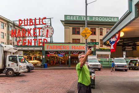 SEATTLE, WASHINGTON - May 19, 2016: Pike Place Market is a public market overlooking the Elliott Bay waterfront in Seattle, Washington. The Market opened in 1907.