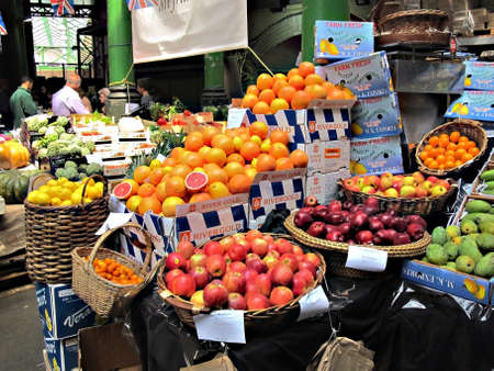 London, UK - September 07, 2019: Fresh fruits in wooden crates on sale at Spitalfields Market, one of the finest surviving Victorian Market Halls in London with fashion, antiques and food stalls.