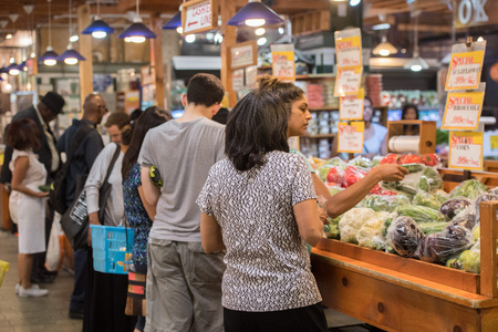 PHILADELPHIA, USA - JUNE 19, 2016 - People buying food and eating at city well famous old market