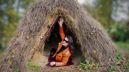 Beautiful autumn landscape with hay bales and wooden house in the park