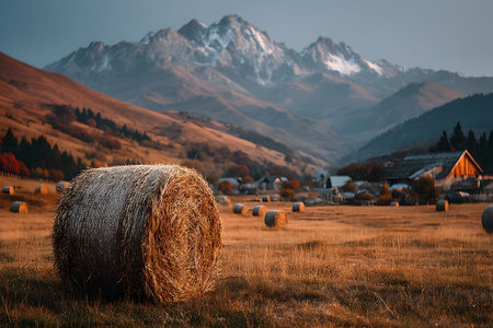 Serene autumn farm scene featuring hay bales scattered across a golden field, set against a backdrop of majestic snow-capped mountains. a rustic barn and vibrant foliage add to the tranquil rural atmosphere. Generative AI