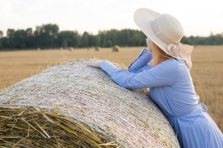 A red-haired woman in a hat and a blue dress walks in a field with haystacks.
