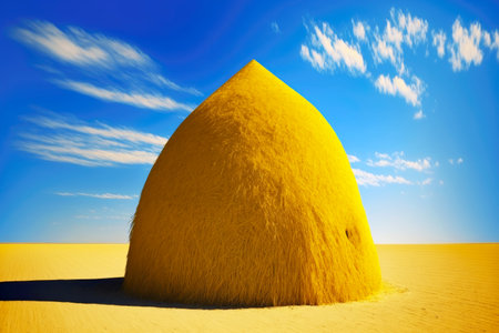 A picturesque scene of a large hay bale standing tall in a vast field of golden wheat, under the suns warm glow.