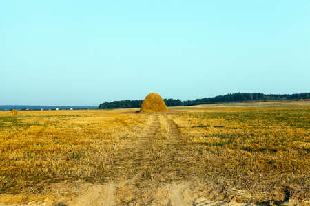 A field with stacks. Haystacks on the field. Hay stocks for the winter. Cattle feed.