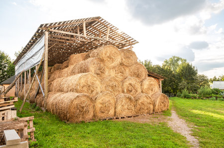 Hay storage with harvested bales of hay for cattle. Agricultural barn canopy with bales hay in summer