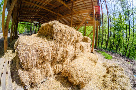 Bales of dry, golden hay lie in a wooden barn under a canopy. Farming and harvesting.Golden straw barn stacked on the farm,