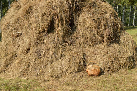 Wicker picnic basket and a haystack - beautiful rural background in Sunny summer day