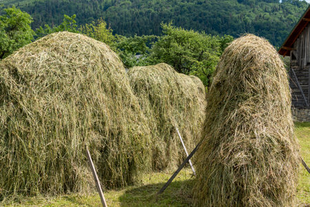 Closeup of a haycock (haystack) in the village. Beautiful summer afternoon in the Carpathian mountains, Ukraine.