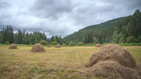 Large number of haystacks with dry hay in a green meadow with wet and fresh grass in cloudy gray weather