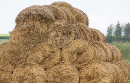 Round haystacks stacked on top of each other in a field. Harvesting hay.