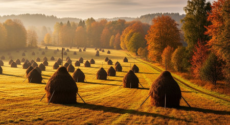 Sunlight casts a warm glow on neatly stacked hay bales in a tranquil autumn landscape, highlighting the beauty of the harvest season.