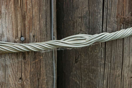 gray twisted metal wire pulls together two brown wooden pillars in the street