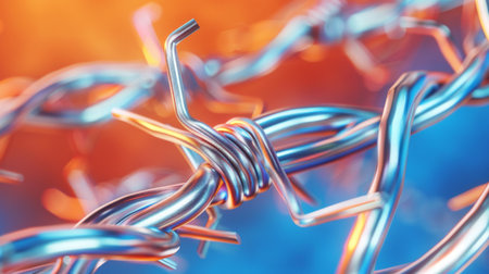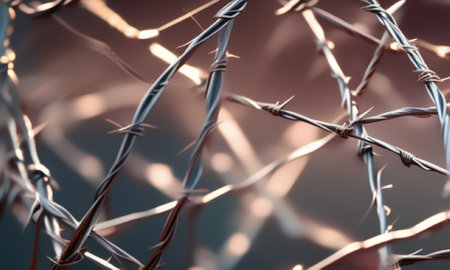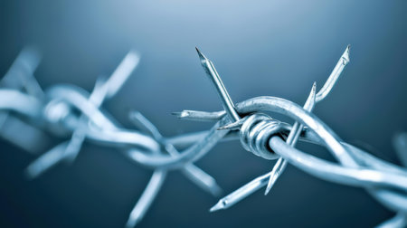 Intricate details of barbed wires surface, highlighting its sharpness and metallic sheen with a dreamy blurred background.