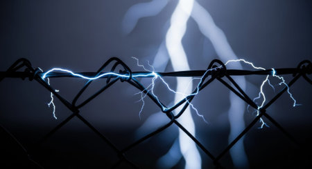 Lightning striking metal fence at night with dramatic electric energy.
