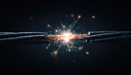 This striking image captures close-up details of metal cables producing bright sparks in a dark setting, highlighting energy and tension.