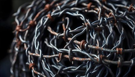 Highlight of barbed wire twisted and weathered, showing the interplay of metal and light in a minimalist environment that emphasizes its rugged nature.