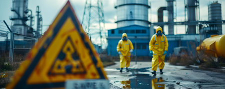 A chemical spill scene with hazmat suits and warning signs emphasizes the importance of safety measures. Concept Chemical spill safety, Hazmat suits, Warning signs, Safety measures