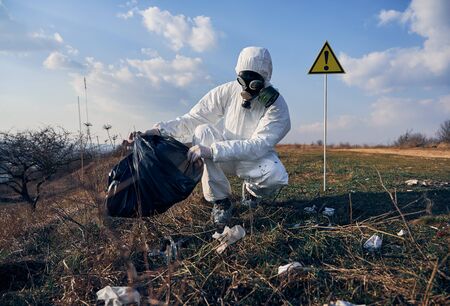 Ecologist wearing white protective coverall, gas mask, crouching collects plastic garbage into black waste bag outdoors, caution sign behind him. Concept of ecology, environmental pollution