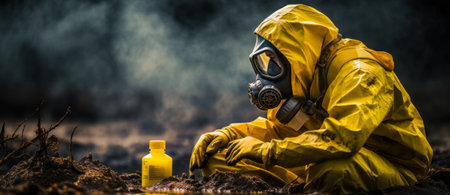 Scientist wearing a yellow hazmat suit and a gas mask is standing in a forest