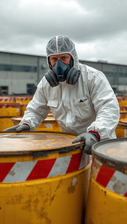 Worker wearing a white protective suit, gloves, and gas mask managing yellow hazardous waste barrels with red warning stripes at an outdoor industrial facility under cloudy skies.