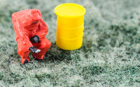 A male environmentalist in a green protective suit and gas mask takes a sample of water in a polluted lake. Waste from production A scientist does a toxicological study of toxic waste