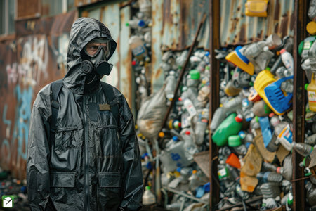 Man in Protective Gas Mask and Suit Near Pile of Plastic Bottles in Urban Environment