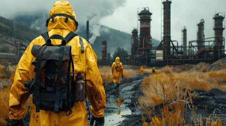 Environmental protection, chemical safety, hazardous materials, safety gear Three figures in yellow protective suits and masks stand against an industrial backdrop with smoke